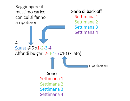 @5 x1-2-3-4 = ramping fino al massimo carico con cui si possono fare 5 ripetizioni, quindi togliere il 10% e fare una serie di back off (stesse ripetizioni del fondamentale). Ogni settimana aumentare di una serie di back off facendo quelle indicate